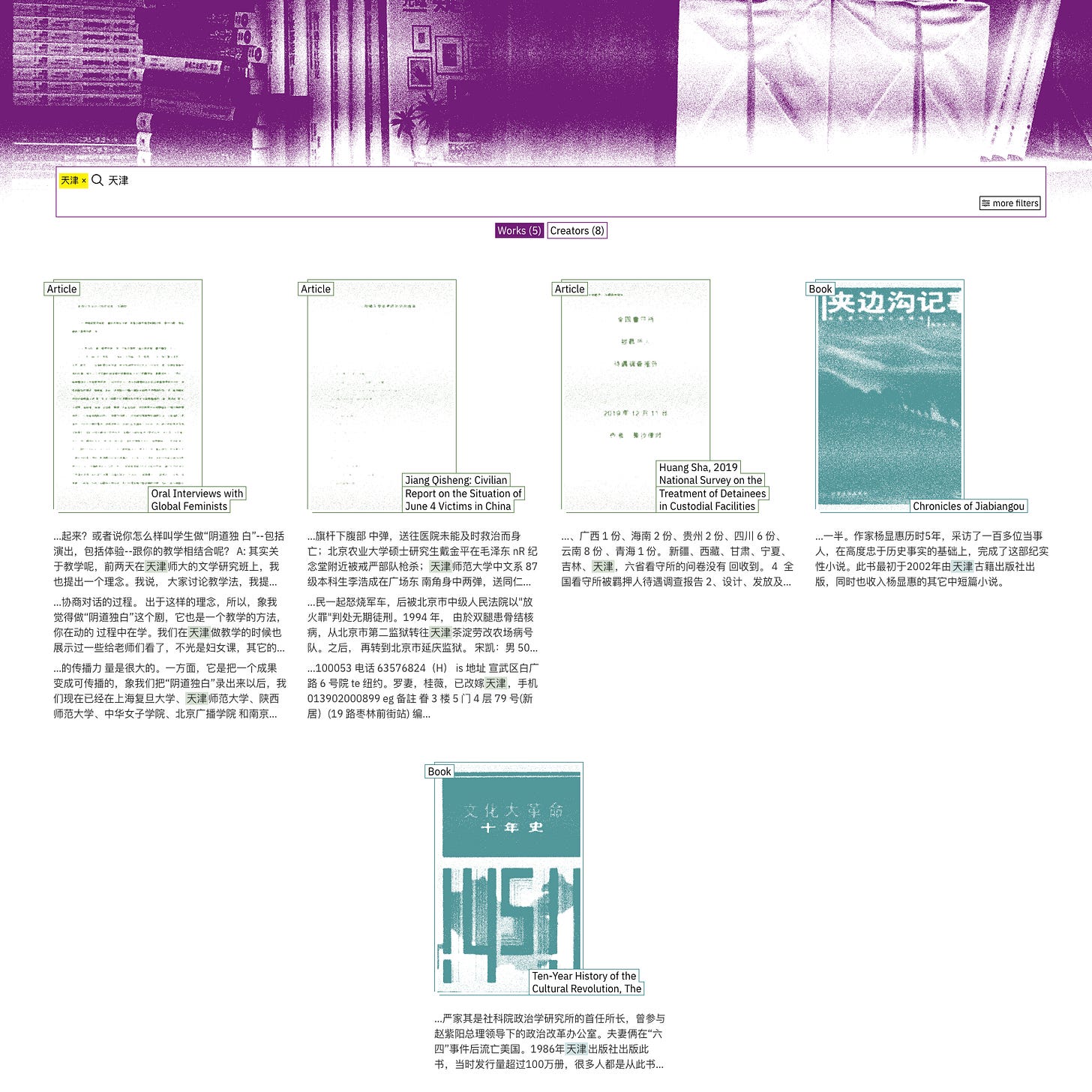 For example, go to the “Works” page, which shows the full archive. At the top of the page is the search bar. If you click on “more filters” you get all the tags and all the filters alphabetized. That makes it easy to search for a term like “Cultural Revolution” or “White Paper Movement” because now they are alphabetized—in Chinese, they are alphabetized based on the pinyin romanization system.