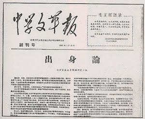 In October 1966, his younger brothers, Yu Luowen and Yu Luomian, mimeographed several hundred copies of “On Class Origins” and distributed them in Guangzhou. Mou Zhijing, a second-year high school student at Beijing No. 4 High School (a prominent school that many second-generation reds attended) who had opposed the couplet during “Red August,” read “On Class Origins” and cherished it. He immediately worked with the Yu brothers to start a printed tabloid called Middle School Cultural Revolution News. The first issue, published on January 18, 1967, printed the full three-page text of “On Class Origins,” crediting it to the “Beijing Research Group on Family Background Issues” instead of Yu Luoke.