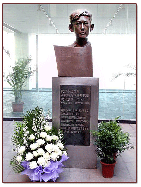 On the Qingming Festival in 2009, a statue of Yu Luoke was unveiled at the Songzhuang Art Museum in Tongzhou, Beijing. The front is engraved with Yu’s words: “We do not recognize any power that cannot be achieved through personal effort.” The base of the statue is engraved with Bei Dao’s poem dedicated to Yu Luoke in 1980: “I am not a hero. In an age without heroes, I just want to be a person.”