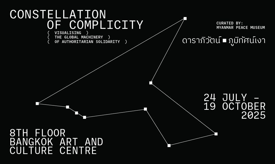 今年七月,一个引人注目的展览在泰国首都曼谷开幕。这个名为“共谋星图:全球威权联盟的可视化呈现”(Constellation of Complicity: Visualising the Global Machinery of Authoritarian Solidarity)的展览,由缅甸艺术家Sai参与策展,展出了来自全球七个地区艺术家的作品:香港、伊朗、缅甸、俄罗斯、叙利亚、西藏和新疆。所有这些地方都由威权政府所掌控。换句话说,这些政权在思想、言语和行动上,经常是互相撑腰、相互支持的。